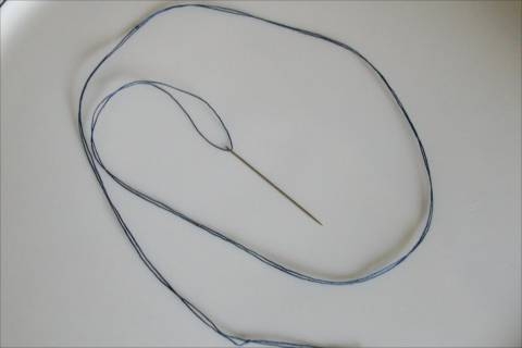 В ровную стальную иголку вставляется нитка, складываешь вдвое (нитки должны быть не запутаны) и делаешь узелок.