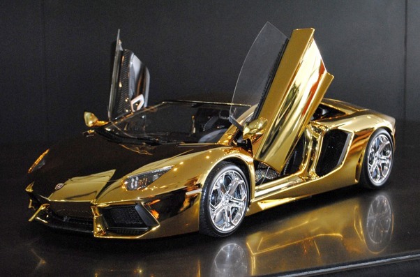 Самый дорогой автомобиль Lamborghini Aventador LP 700−4 сделали в Объединённых Арабских Эмиратах из чистого золота, платины и бриллиантов стоимостью 7,3 миллионов долларов.
