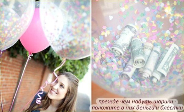 Прежде чем надуть воздушный шарик сверните деньги, в трубочку. Можно на листочках написать различные пожелания, также свернуть и засунуть в шарик. Красивый оригинальный практичный подарок.