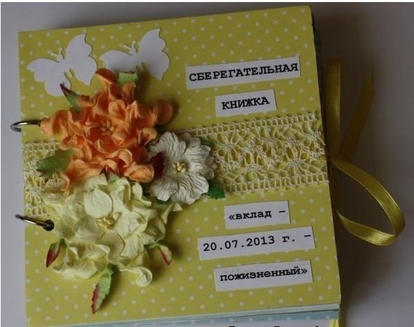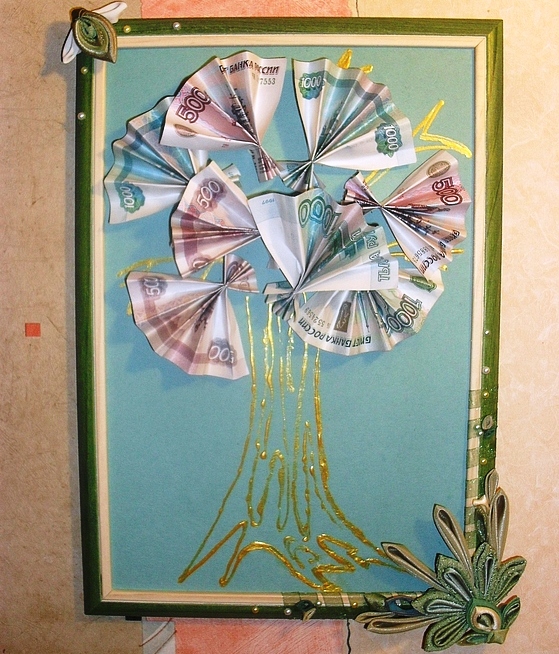 Купите рамку для фотографии и красиво разместите денежные купюры. Можно вырезать картинку с автомобилем, домом или с чемоданом и красивым пейзажем и подписать, что это небольшой вклад для исполнения мечты.