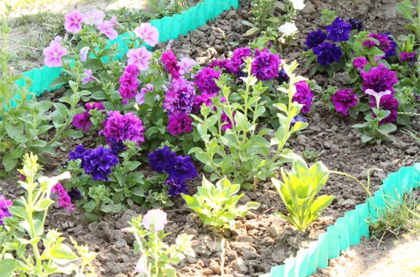 Она комнатные цветы прямо в горшках красиво разложила по четырём громадным клумбам и засыпала их землёй. Получились красивые цветущие клумбы.