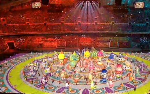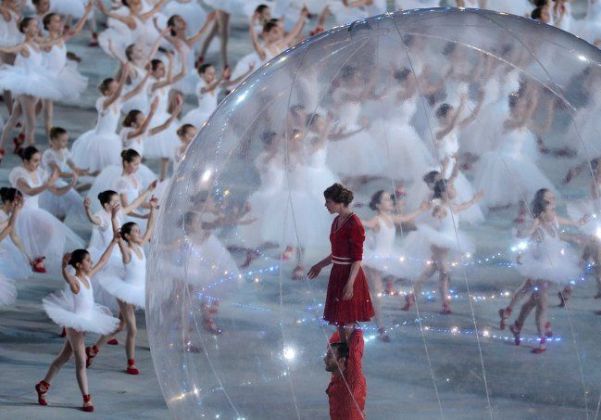 5. Жар-птицы и снег. Акробаты перекатывали большие прозрачные сферы по полю стадиона, над ними парили Жар-птицы. Равновесие — хрупкая грань между «удержаться» и «упасть», но они не боятся падений, всегда готовы встать и начать заново, готовы к борьбе и преодолению.
