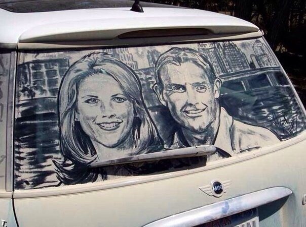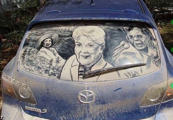 Необычные картины получаются из грязных машин, где в качестве инструмента используются ни краски и кисти, а пыль и пальцы.