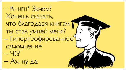 Когда читаешь умные слова других, в голову приходят собственные умные мысли. Кто много читает — тот много знает! Знания опасны! Чтение является причиной возникновения собственного мнения и попытки его высказывания. Пожалуйста, не начинайте читать! Меньше знаешь — крепче спишь!
