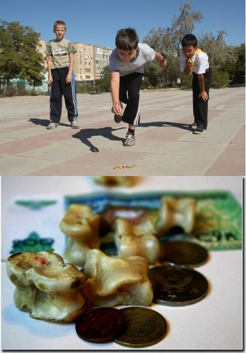 Игра в кости (альчики) с копейками — надо было бросить кость так, чтобы перевернулась монета.