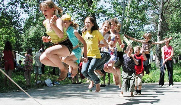 А как прыгали через длинную веревку или связанные между собой скакалки, мы вставали в ряд, а двое крутили, прыгали поочерёдно или по несколько человек, нужно было не задеть прыгалку.
