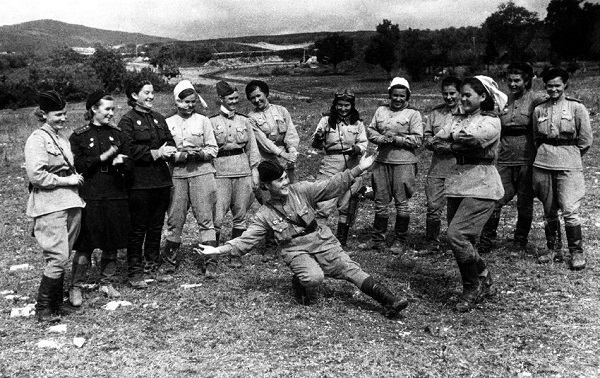 Чтец читает стихотворение «Жди меня», затем исполняется песня «Синий платочек», на проекторе слайды — фотографии женщин-фронтовиков.