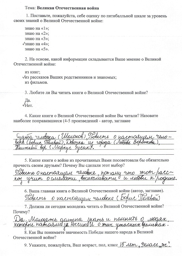 В четвертом вопросе надо было написать наиболее понравившиеся произведения, которые они прочитали о Великой Отечественной войне. В скобках написано, сколько человек прочитали данное произведение.