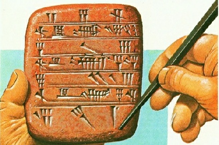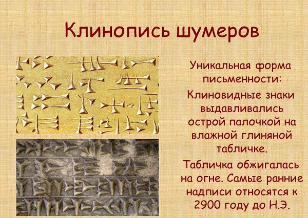 Вокруг Шумера, на берегах Тигра и Евфрата, было мало деревьев, зато было сколько угодно глины и тростника, поэтому неудивительно, что шумеры стали делать книги из глины. На сырой мягкой глине, размятой в пластинки они выдавливали палочкой в глину под углом так, что оставались следы, похожие на клинышки. Отсюда пошло название КЛИНОПИСЬ. А вот как выглядела клинописная азбука.