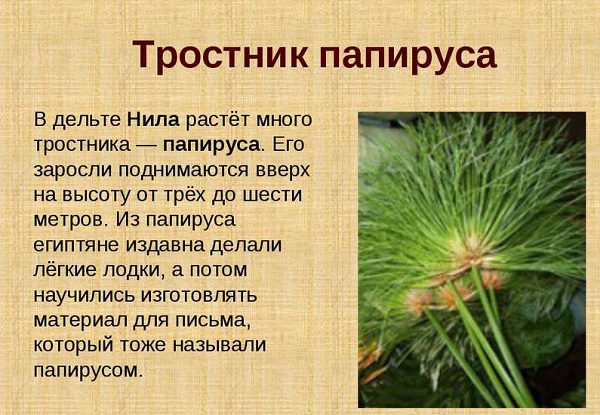 Папирус изобрели в Египте. Это материал для письма, напоминающий бумагу. На сгибах он быстро ломается, зато его легко сворачивать в обычный рулон — свиток. Делали папирус из стеблей тростника, который рос в болоте.
