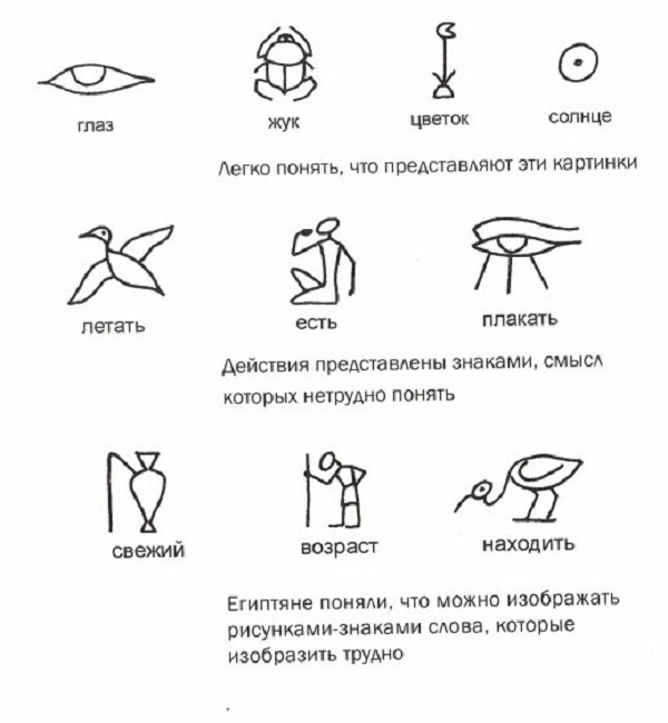 Египтяне, как и древний народ — шумеры поняли, что можно изображать рисунками-знаками слова, которые изобразить трудно — логограммы — это простые рисунки, обозначающие целое слово. К примеру, вот как они изображали слова.