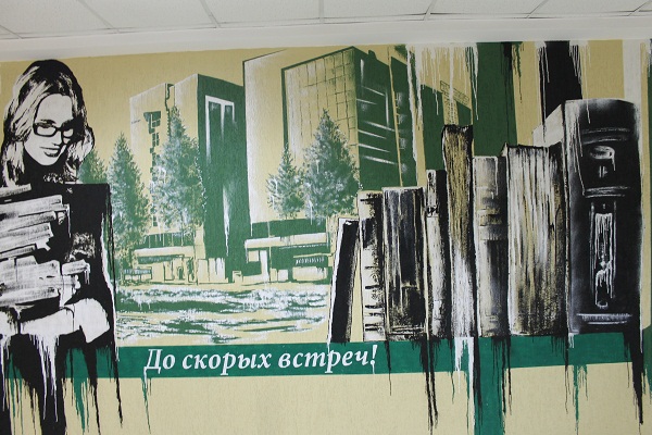 Это современное здание областной библиотеки оснащённое самой совершенной техникой. Оно рассчитано на 2 млн томов хранения, 1140 читательских мест. На каждом этаже на стенах выполненные дипломные работы студентов в виде рисунков граффити, причем каждый рисунок соответствует отделу этажа. Подробности об этих и других работах: https://www.irk.ru/news/favourite/article/41945/