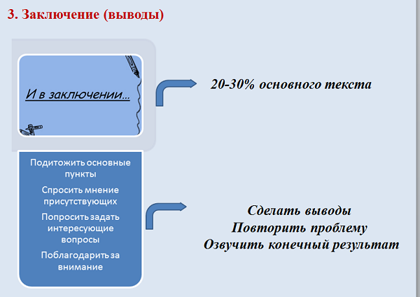 В заключении необходимо суммировать сказанное и сделать выводы. Запомните, что конец вашего выступления запомнится лучше, чем любая другая его часть. Поэтому вложите в ваши заключительные слова особый смысл.