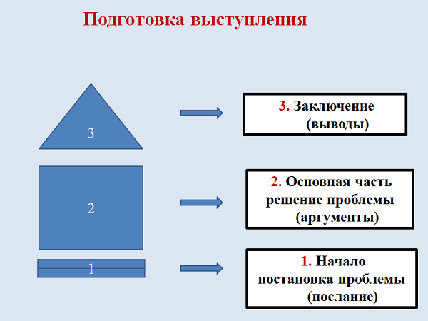 И так приступим к подготовке текстовой части. Подготовка может строиться по технологии «дом», которая напоминает элементы «дома»: фундамент, стены и крышу. Простым языком: Начало (послание) постановка проблемы, основная часть (аргументы) решение этой проблемы и заключение (выводы).
