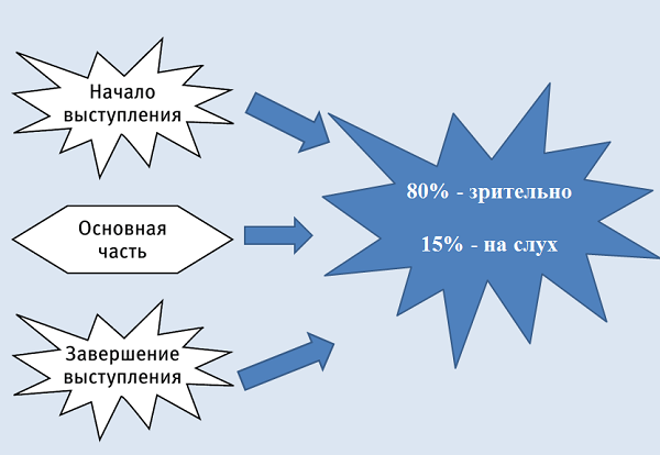 Не забывайте еще и то, что обычно более 80% информации человек воспринимает зрительно, и только около 15% — на слух. Иллюстрируйте свое выступление: наглядностью, презентациями, видеофрагментами, фотографиями, а если это уместно, применяйте эмблемы, плакаты и другую символику.