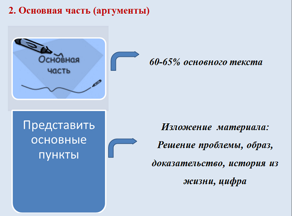 Основная часть должна содержать образ, изложение материала, доказательство, историю из жизни, цифру. Важно отметить, не следует употреблять много цифр. Они не запомнятся. А одна цифра, на фоне отсутствия других, запомнится всегда.