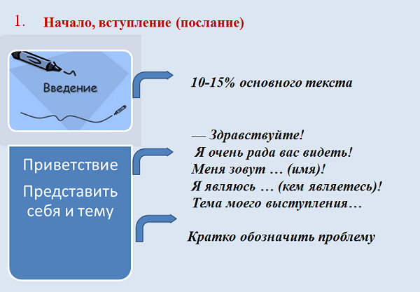 При приветствии не допускайте оправдания и извинения перед аудиторией. Не нужно перед ней оправдываться в стиле «Я могу выступить неудачно, так как немного волнуюсь…» просто скажите: «Сегодня великий день, поэтому я волнуюсь...»