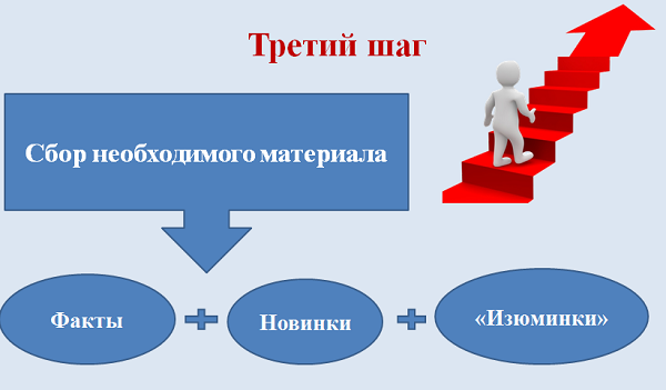 Третьим шагом наступает сложная череда сбора необходимого материала, вычленения из него наиболее важной, значимой информации. Найдите способ подать информацию так, чтобы участники захотели слушать вас. Для этого ваш материал должен быть максимально полезным для той аудитории, где вы будете выступать. Но не следует понимать под материалом традиционный набор фактов, это не правильно. Полезней для нас узнать о ваших новинках, фантазиях воплощенных в реальность.