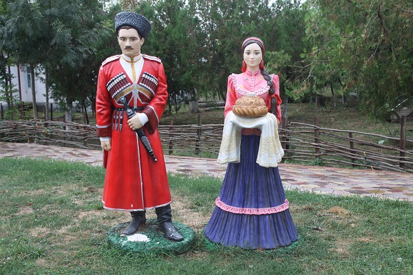 На въезде в станицу Натухаевская нас встречали привлекательные реалистичные фигуры, одетые в национальную одежду с хлебом-солью (думаю, что сделаны они из полистоуна). По моему мнению, это прекрасная идея, позитивная!