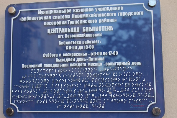 Обратила внимание — во всех библиотеках, в которых мы побывали, создана доступная среда для инвалидов по зрению. На прозрачных полотнах дверей предусмотрены яркие контрастные маркировки — круг (диаметр 15 см) желтого цвета, вывески-таблицы с выпуклыми надписями или шрифтом Брайля.