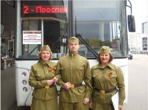 В рамках республиканской акции «Победная весна» под девизом «Прочти книгу о войне — стань ближе к подвигу» библиотекари Зеленодольской ЦБС 4 мая одетые в военную форму проводили акцию с прочтением вслух отрывков из лучших произведений о войне в салоне автобуса №2) по маршруту его следования. Подробнее: https://zeldolbib.ru/fotootchety-2016/prochti-knigu-o-vojne-stan-blizhe-k-po.php