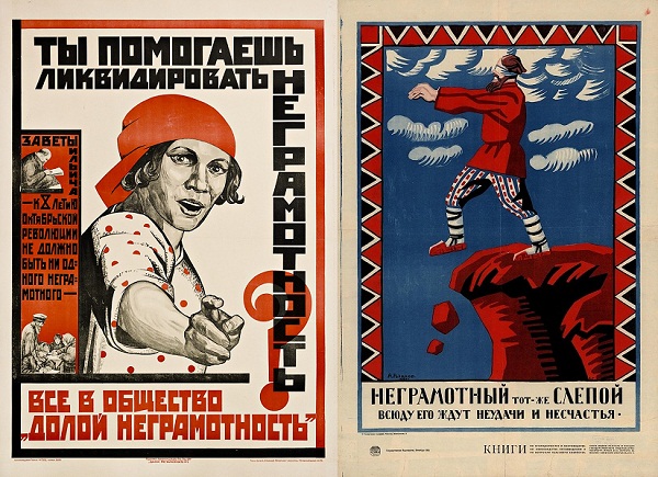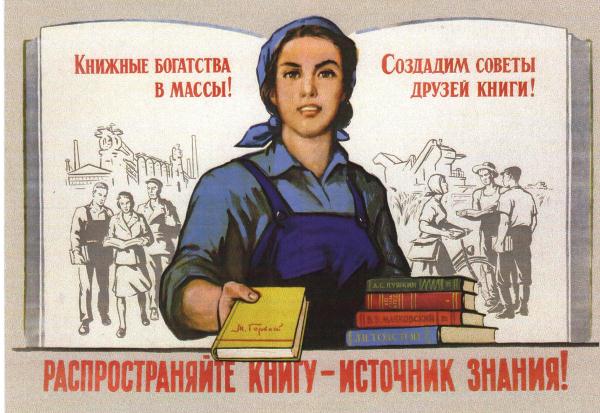 Вспомним, как велась агитационная пропаганда в советские годы. С началом гражданской войны появилось огромное количество плакатов, посвящённых преодолению безграмотности, пропаганде книг и чтения, плакаты с призывами посещать библиотеки и избы-читальни. Плакаты смотрите здесь: https://ru.wikipedia.org/wiki/8B