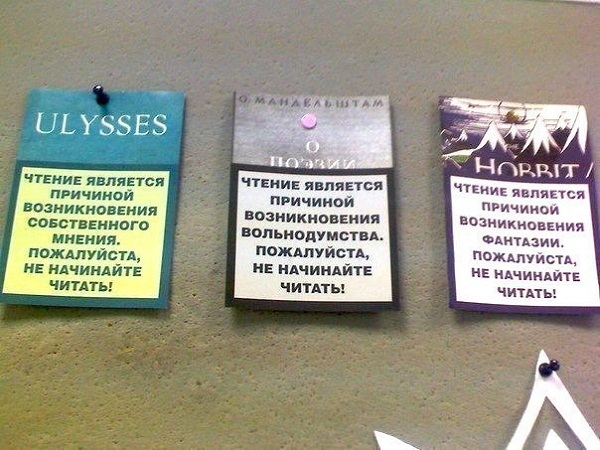 Постоянное назидание, что надо читать, может вызвать обратную реакцию. Иногда полезно поагитировать против чтения, возможно обратная реакция на такую агитацию и даст свой положительный результат. Читайте: Осторожно! Читать вредно! Кстати, я выпустила несколько буклетов с заголовком " Осторожно! Читать вредно! ", так вот, разбирают их, как «горячие пирожки».