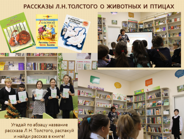 Мы провели конкурс «Выбор книг вслепую». Детские книжки с рассказами о животных Л.Н. Толстого упаковали в большие конверты и пронумеровали их. Дети не знали, какое произведение находится в конверте. Участники конкурса вытянули номера, выбрали конверты соответственно номеру, достали из конверта книжку и начитают выразительно читать страницу своего номера. На следующем этапе книги были упакованы в бумагу, сверху приклеена бумага с абзацем из произведений Толстого. Дети должны угадать, с какого произведения взят отрывок, распаковать книгу и найти этот абзац в книге.