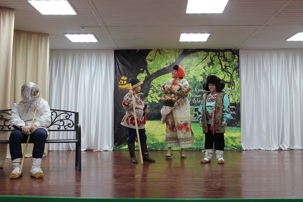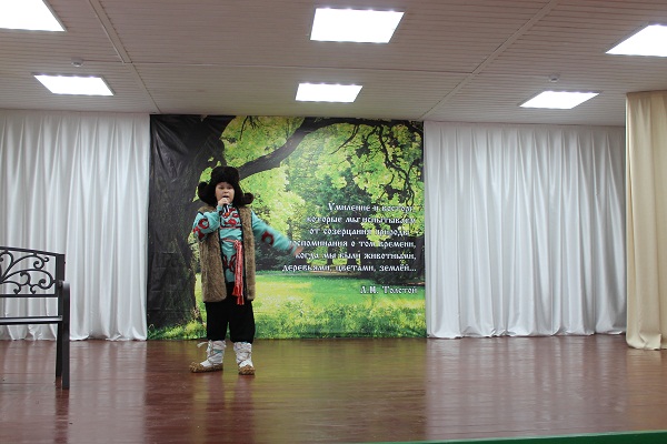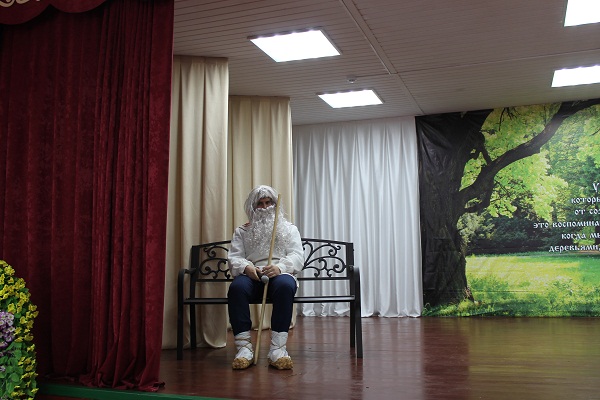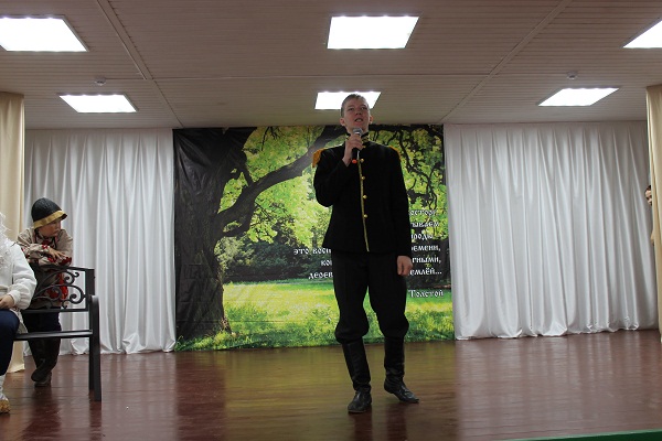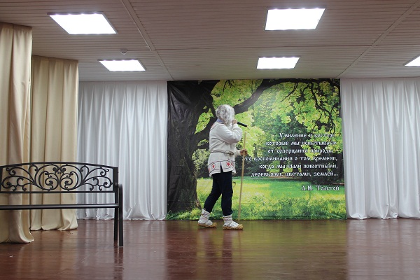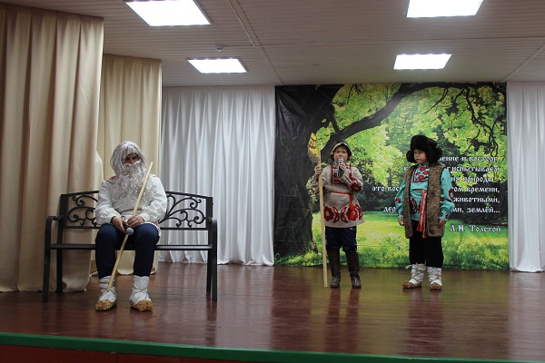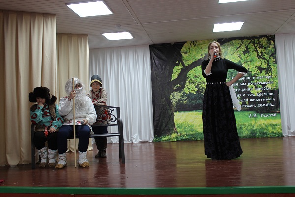 (На сцене висит баннер с русской природой и цитатой Л.Н. Толстого.)