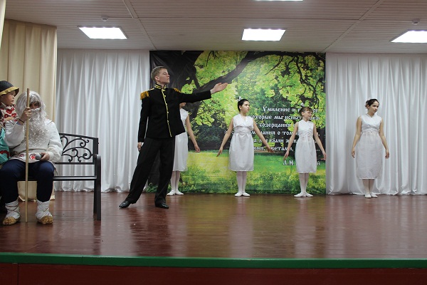 (Выходит Наташа Ростова, читает отрывок из произведения «Война и мир», затем поёт песню «По улице мостовой» и танцует.)