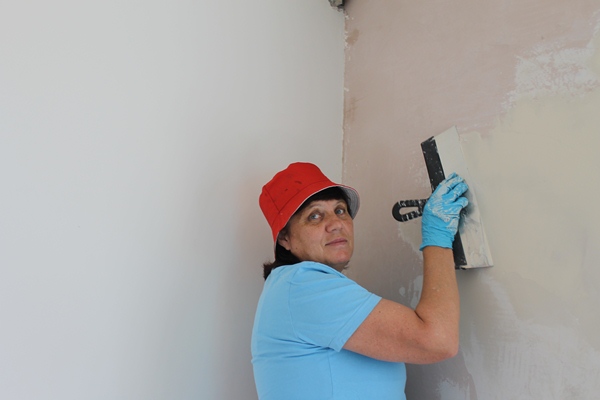 В зоне отдыха заштукатуренные стены мы покрыли грунтовкой, затем нанесли два слоя шпатлевки. Наносили два вида шпатлевки, проверенные временем и испытанные нами. Первый слой — это универсальная гипсовая шпаклевка Фугенфюллер, которая разводится водой. Готовый раствор получается пластичным, без комочков и легко наносится, очень низкий расход. Так как стены были идеально ровные, шпаклевать было легко. На другой день нанесли готовую финишную шпаклевку ТЕКС «Профи».