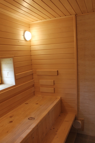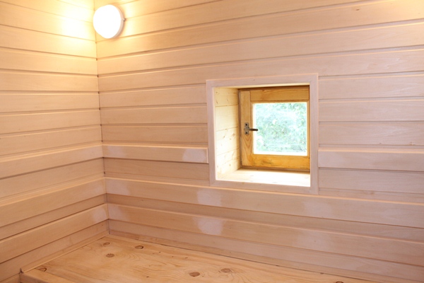 Стены, потолок — липа высшего сорта. Полок сделали из неизвестной нам древесины — уже несколько лет у нас хранились четыре доски толщиной 5 см, шириной 50 см, длинной около 4 метров. Нам хотелось полок сделать из цельной древесины, поэтому выбрали эти доски. Полок обработали специальным маслом для полков алкидное Tikkurila Supi Laudesuoja. Текстура дерева сразу выделилась.