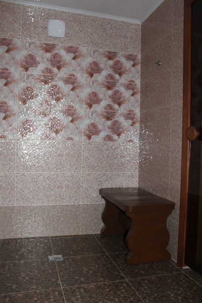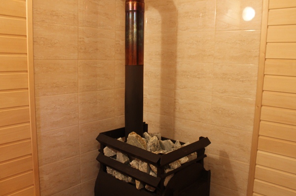 Стены сауны, где находится печь, а также под полком (лежаком), пол выложили керамической плиткой, чтобы было легко убирать.