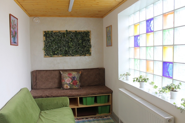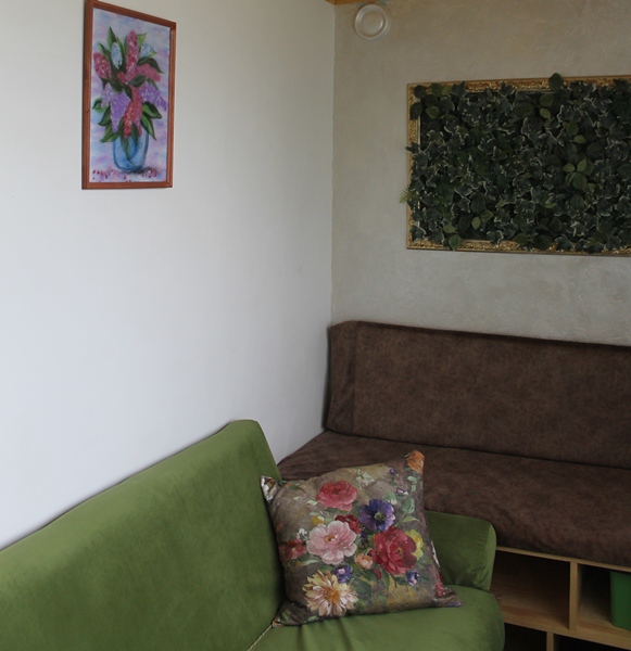 Скамейку-полку или лавку-стеллаж сделали из мебельных щитов. Чтобы было на ней приятно сидеть и облокачиваться на стену сделали матрасики из поролона, которые обшили ватином и обтянули велюром. В лавке-стеллаже хранятся различные предметы. Это очень практичное решение для небольшой комнаты. Зеленые контейнеры гармонируют с диванчиком. Маленький диванчик обтянули зеленым бархатом. Бархат и велюр ласкают тело.