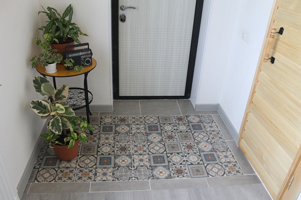 Давно хотела выложить из плитки ковёр, и это у нас с мужем получилось. Плитка прекрасно сочетается с влагостойким ламинатом толщиной 12 мм, подходит для теплого пола.
