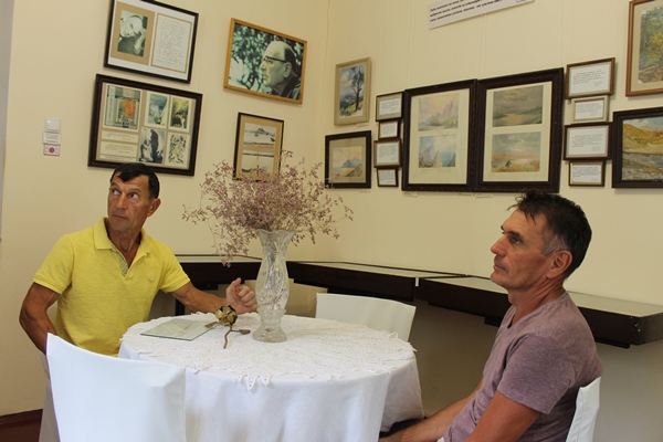 Когда мы зашли во двор музея, нас встретил Аким Гиясов. Сказал, что у них гости. Мы увидели, как во дворе за столом сидели около десяти молодых женщин, все они пили чай и ели арбуз. Мы подумали, что это к ним приехали гости. Когда мы обошли весь музей, Аким нас снова привёл к столу. Стол был уже убран и чист. Хозяйка дома Гульнара тут же стала накрывать стол восточными сладостями. Аким налил нам в пиалы чай. Вскоре хозяйка вынесла нарезанный арбуз, он оказался таким вкусным! Гульнара рассказала, как выбирать арбузы. Аким сказал, что раньше работал на заводе, где трудились 10 тыс. человек. Он привык к общению, поэтому и создал музей, ведь сейчас люди ограждаются друг от друга… Аким и Гульнара ранее жили, как и мы в Узбекистане. Нам такое гостеприимство знакомо. Мой муж тоже всех, кто заходит к нам в дом, приглашает к столу. Один человек заметил, что это свойственно людям, жившим в Средней Азии.