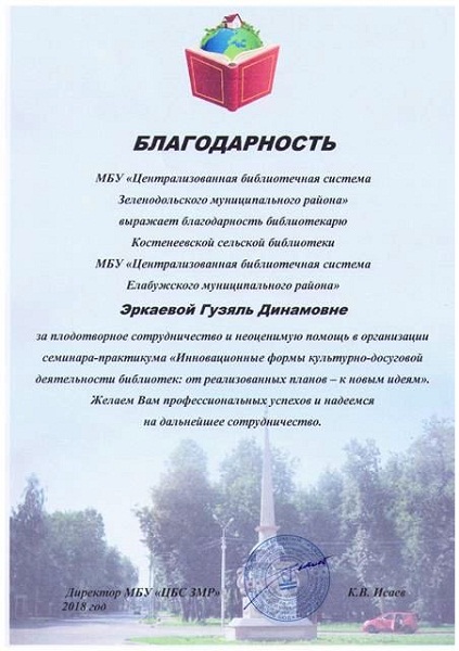 Большое спасибо Исаеву Константину Владимировичу, директору Зеленодольской ЦБС и Анисе Оченевой, ведущему методисту!