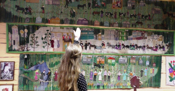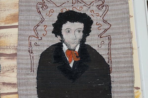 Но больше всего впечатлили волшебные картины-половики Евдокии Пановой. Евдокия Васильевна начала ткать, когда ей было за шестьдесят. Сначала ткала традиционные геометрические узоры и цветы, а потом постепенно рисунок стал усложняться, пока она не довела свою работу до создания больших, сложных композиций. Первое, что выткала Евдокия, был портрет Пушкина. Далее грандиозные работы, посвященные русской деревне — «Праздничное гулянье», «Свадебный поезд» и «Раскулачивание».