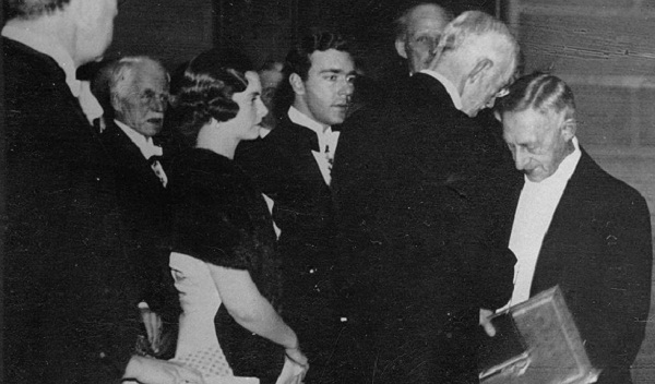 СЛАЙД — Король Швеции Густав V вручает Ивану Бунину диплом нобелевского лауреата и золотую медаль. 1933 год.