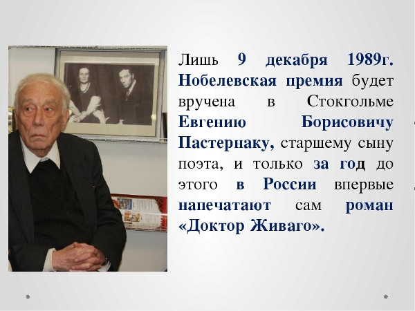 Борис Леонидович Пастернак много раз претендовал на роль лауреата нобелевской премии, еще до выпуска своего знаменитого, на весь мир романа «Доктор Живаго», за который он получил высокую награду в 1958 году. В книге описывается трагическая история жизни главного героя, попавшего в чудовищный круговорот исторических событий — революцию, Гражданскую войну.