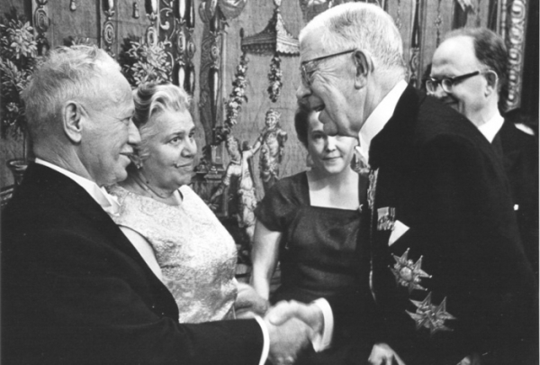 СЛАЙД — Вручение Михаилу Шолохову диплома лауреата Нобелевской премии из рук короля Швеции Густава VI в Большом Концертном зале Стокгольмской ратуши.