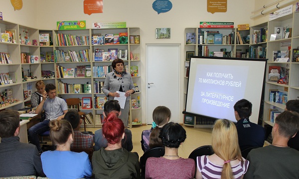 - Презентация Как получить 70 миллионов рублей за литературное произведение, которая сопровождает выступление библиотекаря.