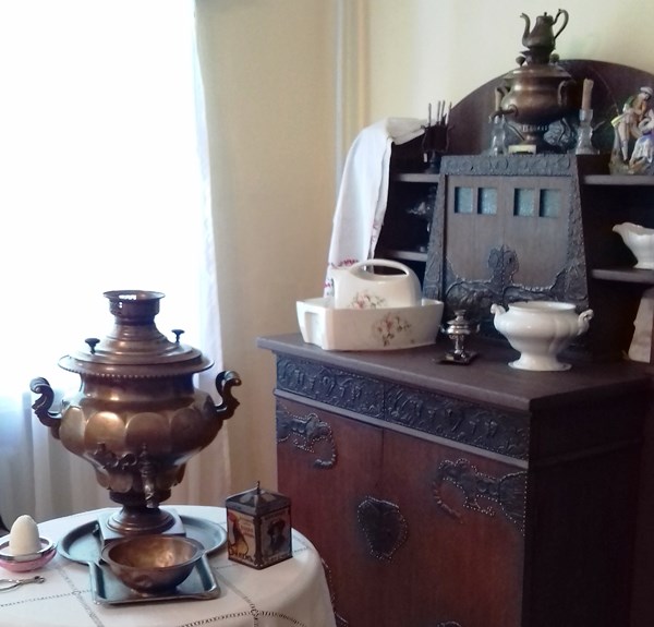 Затем «госпожа Башенина» пригласила нас в столовую с начищенным самоваром на столе, в которой хозяйничала «домашняя прислуга». Горничная рассказала нам о том, чем она по́тчует своих хозяев, как пьют чай вприкуску с сахаром, отламывая его специальными щипчиками. Её рассказ об антикварных самоварах России, 2-й половины XIX века вызвал наибольший интерес, особенно самовар «Эгоист» (был назван так, потому что был рассчитан на одного человека, ёмкость ровно один стакан) и самовар «Тет-а-тет», буквально «на двоих», (небольшого размера, объемом на 4−5 стаканов воды).