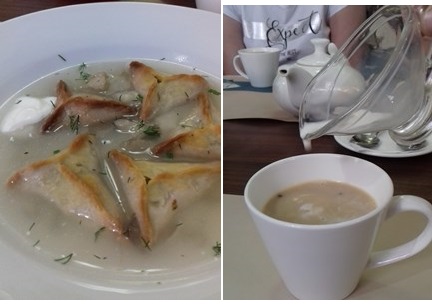 Купеческий обед в ресторане (мы там обедали, как и купцы, около двух пополудни), приготовленный по старинным рецептам: суп из полбы с мясом на сливках, второе блюдо состояло из запеченных маленьких треугольников с гречневой начинкой на грибном бульоне, пирог с квашеной капустой и красной рыбой (его принято разламывать над головой именинника на счастье, мы попробовали на нашей изменнице-библиотекаре), морковный чай со сливками, взрослым в меню входят наливки из клюквы и хрена, красного перца на меду. Перед началом обеда сотрудник ресторана представляет меню, рассказывает, как готовятся блюда и красивую историю о любви, о которой я рассказываю ниже в женских историях. Купеческий обед — это что-то! Стоимость обеда всего лишь 300 рублей.
