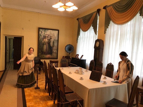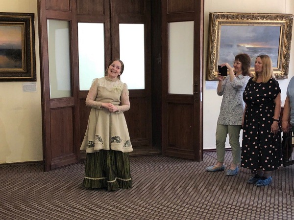 В начале экскурсии нам рассказали о жизни и деятельности П.А. Башенина и его семьи, а потом в гостиной с камином и роялем нас встречала его «супруга» — очень милая сотрудница музея с приятным голосов, одетая в одежду того времени.