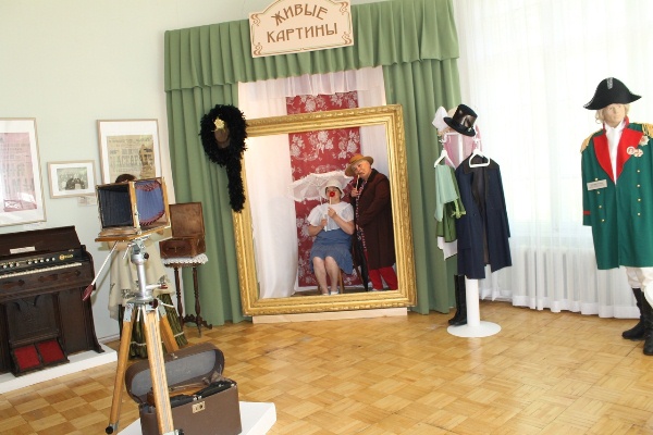 Сразу в глаза бросилась фотозона «Живые картины», рядом вешалка, на которой висела одежда того времени. Нам предложили примерить костюмы и сфотографироваться в фотозоне.