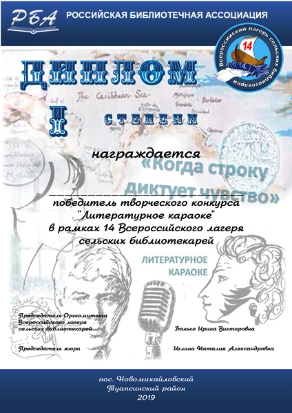 Со 2 по 8 сентября в Краснодарском крае Туапсинского района в поселке Новомихайловском в пансионате «Химик» прошел XIV Всероссийский лагерь сельских библиотекарей, организаторами выступили Секция сельских библиотек, Секция центральных библиотек субъектов РФ и Секция публичных библиотек РБА при поддержке Министерства культуры Российской Федерации и Администрации Туапсинского района Краснодарского края. Автор идеи, организатор и вдохновитель лагеря, всеми любимая и очень уважаемая — Ирина Викторовна Банько, директор МБУК «Туапсинский историко-краеведческий музей им. Н.Г. Полетаева», Краснодарский край.