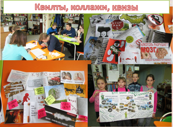 Квилт — это слово имеет несколько значений. Изначально квилт — это стеганое полотно, выполненное в технике лоскутного шитья. Другое его толкование — «блочное размещение информации», часто используется на тренингах, семинарах. Суть библиотечного квилта в том, чтобы составить плакат из лоскутков по определенной теме. Основу квилта, его макет готовит библиотекарь, но каждый читатель может поучаствовать в его наполнении. Записывая ответы на предлагаемые вопросы, пожелания, мнения на разноцветные стикеры и прикрепляя их, читатели вместе с библиотекарем создают узор лоскутного полотна на информационном стенде, то есть каждый может внести свой «лоскуток» в общее дело.