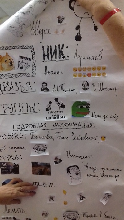 На склеенных листах ватмана или обоях создаётся страничка соцсети какого-нибудь литературного героя или писателя, к примеру, Наташи Ростовой или М. Лермонтова. Ребята придумывают ему ник, пишут его интересы, рисуют картинки и пишут к ним комментарии — всё как социальной сети ВКонтакте. Очень интересная идея!