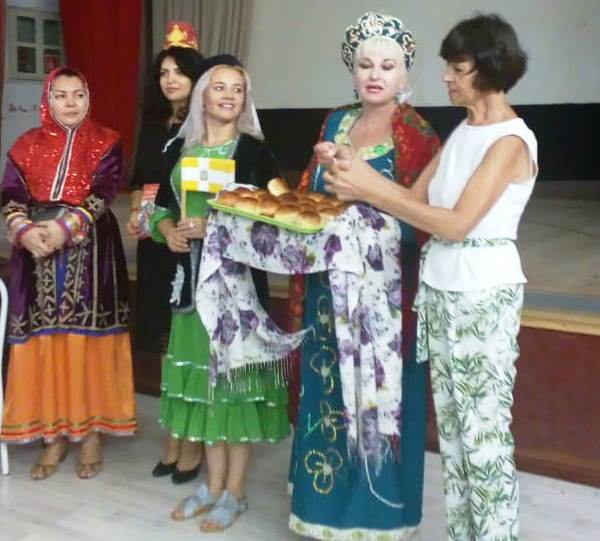 Мы вышли в национальных головных уборах с флажками нашей республики под задорную музыку, мы спели, станцевали, показали, как мы читаем книги до дыр (просунули в дырки головы), подарили национальное блюдо чак-чак.
